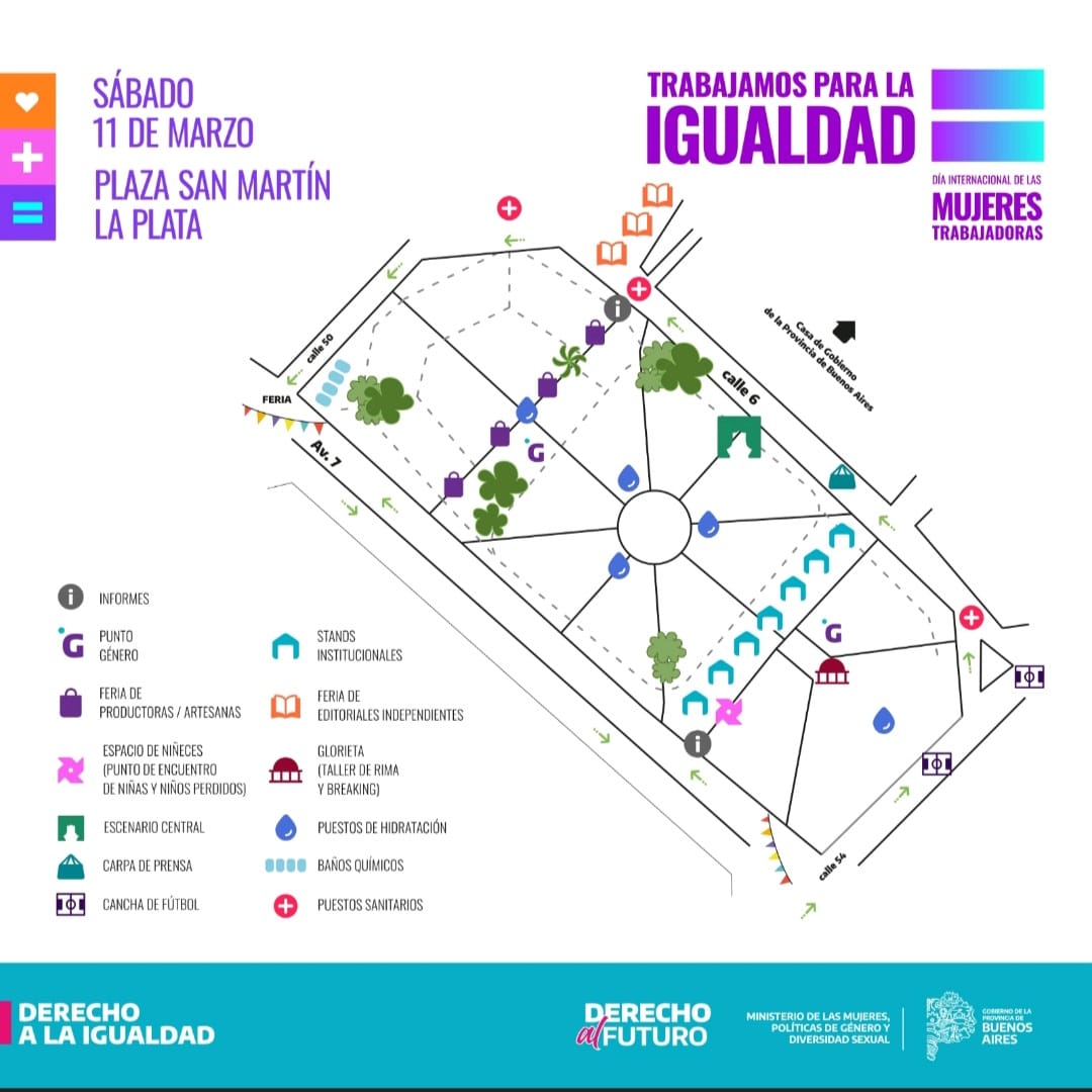 En el marco de una nueva conmemoración del Día Internacional de las Mujeres Trabajadoras, el Ministerio de las Mujeres, Políticas de Género y Diversidad Sexual de la provincia de Buenos Aires convoca a una jornada de actividades el sábado 11 de marzo, a partir de las 12:30 en Plaza San Martín, ubicada en las calles 7 y 50 de la ciudad de La Plata.