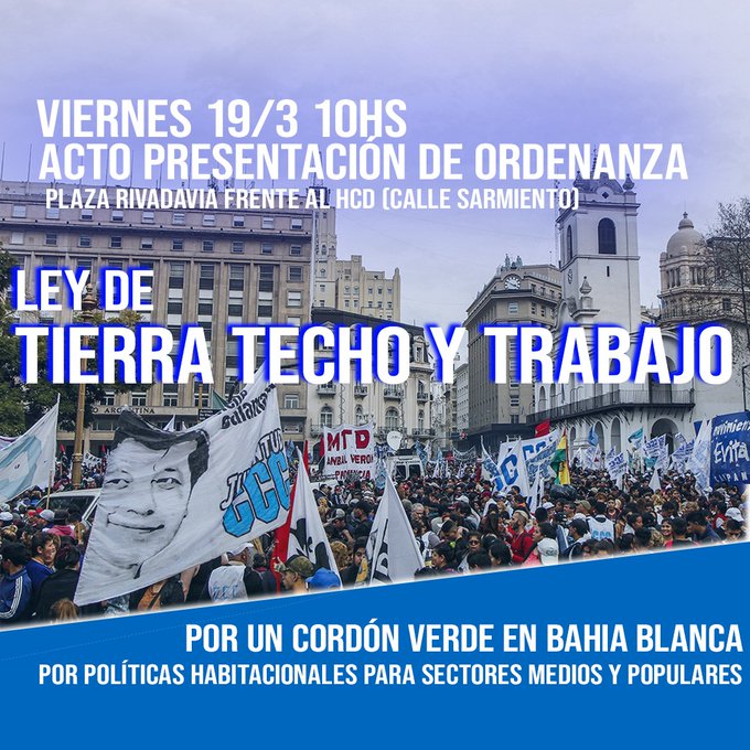 HOY SE LLEVO A CABO UN ACTO FRENTE AL CONSEJO DELIBERANTE DE NUESTRA CIUDAD CON MOTIVO DE LA PRESENTACION DE LA ORDENANZA,POR UN CORDON VERDE EN BAHIABLANCA,POR POLITICAS HABITACIONALES,PARA SECTORES MEDIOS Y POPULARES. TIERRA TECHO,Y TRABAJO