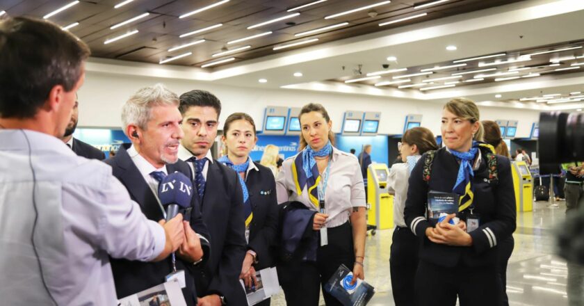 Aeronavegantes realizó una campaña de concientización sobre la situación que viven los trabajadores de Aerolíneas Argentinas. Lo hicieron en el marco del conflicto paritario y la amenaza de privatización del gobierno libertario de Javier Milei. Entregaron entregaron volantes y stickers a los pasajeros.