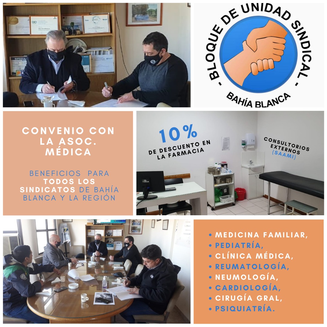 Desde el Bloque “Unidad Sindical” se ha conseguido realizar un convenio excelentísimo con la Asociación Médica de Bahía Blanca que permite evitar tener que pagar arancel diferenciado en las especialidades que ahí se mencionan en cartilla adjunta, utilizando los consultorios externos SAAMI que son de la Asociación Médica es para todas las obras sociales y SINDICATOS DE LA CIUDAD Y LA REGIÓN que tengan convenio con la AMBB, solo con sacar turno vía web o por teléfono. Dentro de la semana ya tenés el turno con el compromiso de poder sumar franja horaria, que al día de hoy sería de 16 hs a 20 hs, como así también especialistas según requiera la demanda. Además se acordó la posibilidad de trabajar con la farmacia de ellos, que se realizaría un descuento extra del 10% independiente sumándoselo al descuento que tiene la obra social en cuestión. También pueden llegar a realizar consultas médicas a través de video-llamadas sin costo de arancel alguno.
