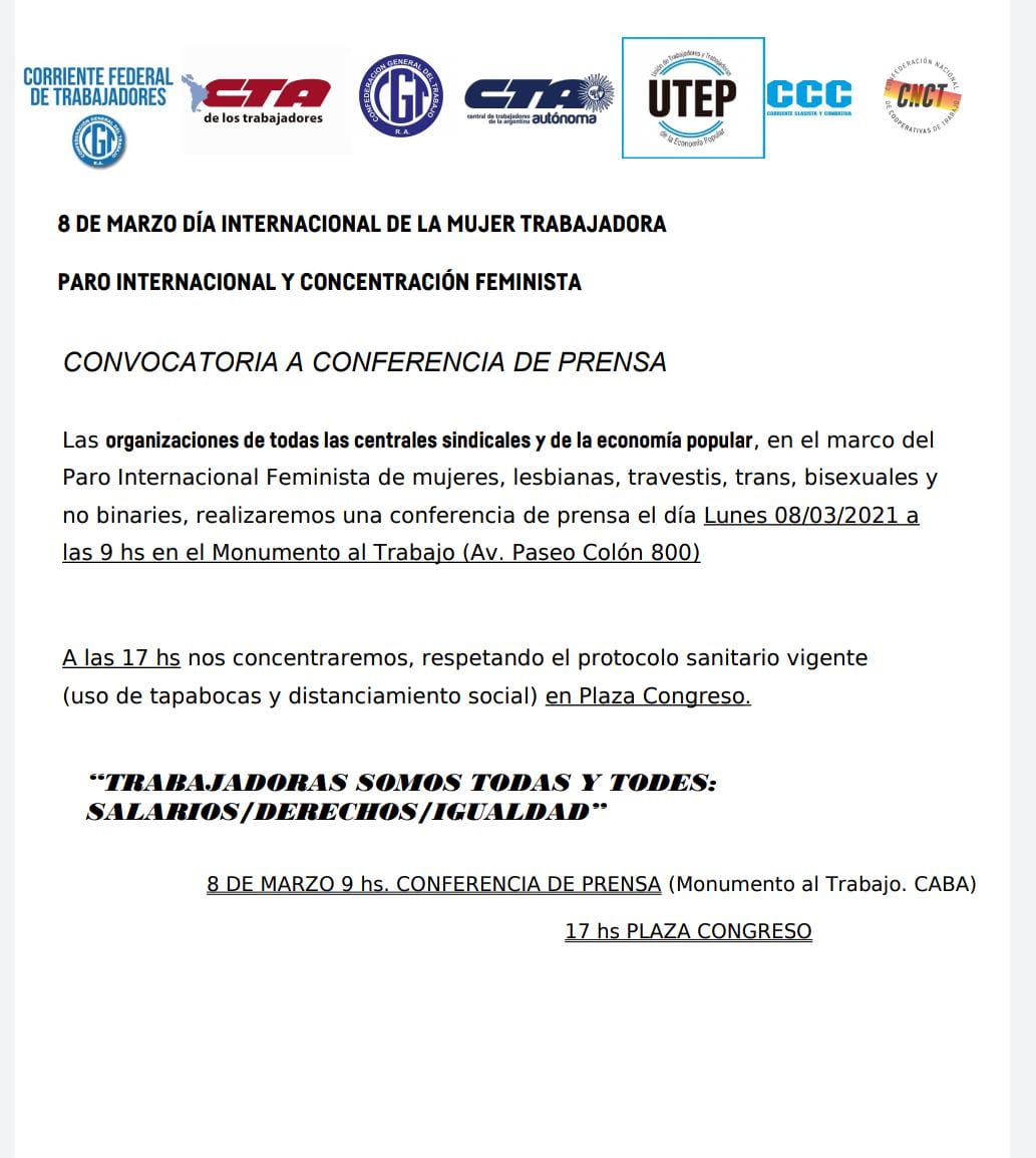 Desde la secretaría de Género del Bloque de Unidad Sindical, en concordancia con la participación de Mujeres Sindicalistas de todas las Centrales Obreras, Diversidades o disidencias; hacemos la convocatoria en Bahía Blanca para participar de las actividades del 8M