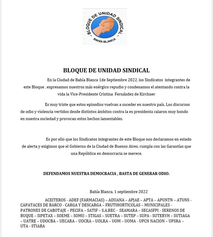 ActualidadBLOQUE DE UNIDAD SINDICAL BAHIA BLANCA REPUDIA EL ATAQUE A CRISTINA FABIAN MERA3 años atrás3 años atrás01 minutos FacebookXWhatsApp Comparte esto: Haz clic para compartir en Facebook (Se abre en una ventana nueva) Facebook Haz clic para compartir en X (Se abre en una ventana nueva) X Haz clic para compartir en instagram (Se abre en una ventana nueva) instagram Me gusta esto:Me gusta Cargando... Navegación de entradas Anterior: CGT REGIONAL BAHIA BLANCA ACOMPAÑA A LA MARCHA HOY EN PLAZA RIVADAVIA 14 HSSiguiente: CONVOCATORIA CGT REGIONAL BAHIA BLANCA A TODOS LOS GREMIOS
