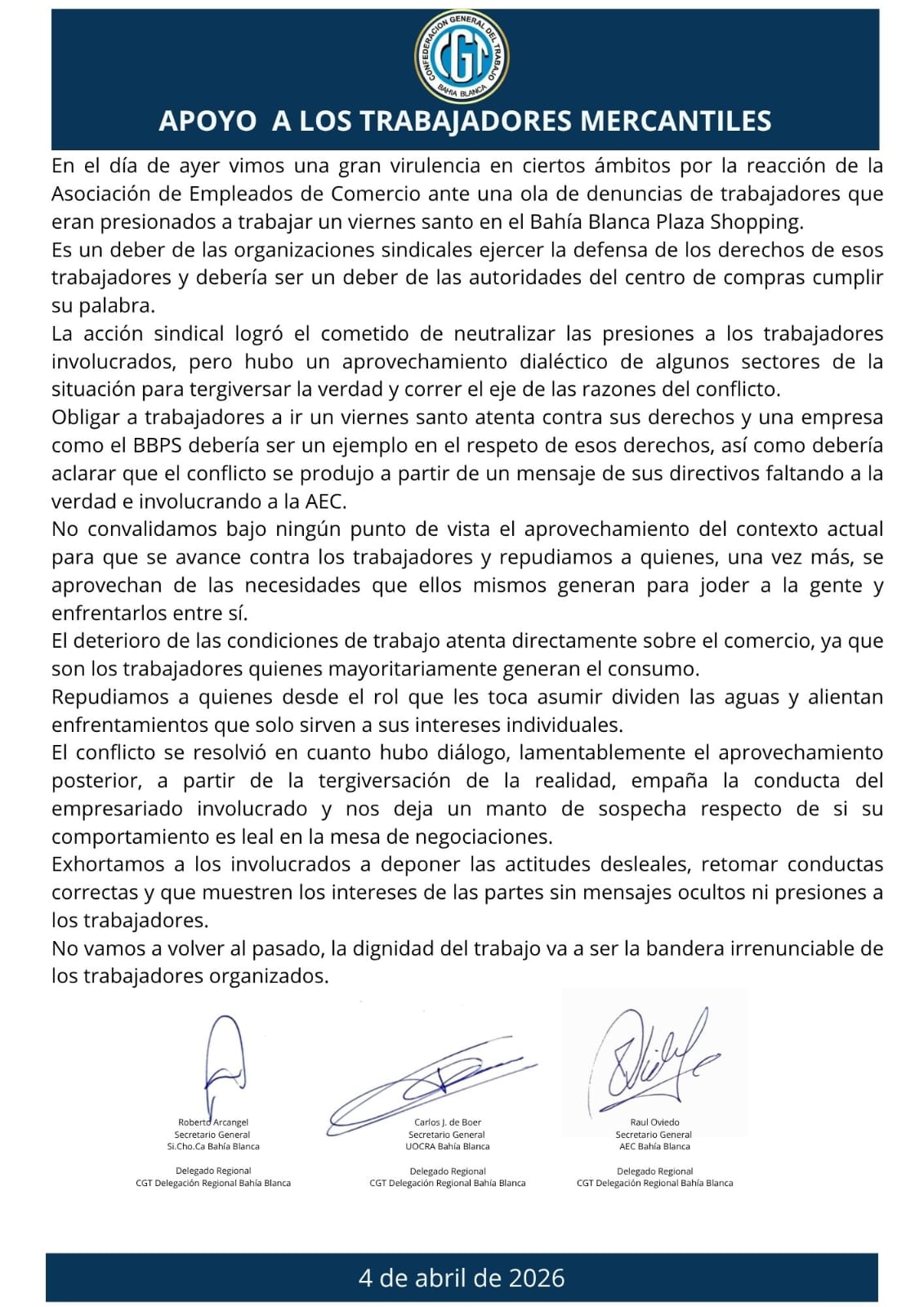 CGT BAHIA BLANCA DIO UN CONTUNDENTE APOYO A LOS TRABAJADORES MERCANTILES EN UN COMUNICADO FABIAN MERA21 horas atrás 0