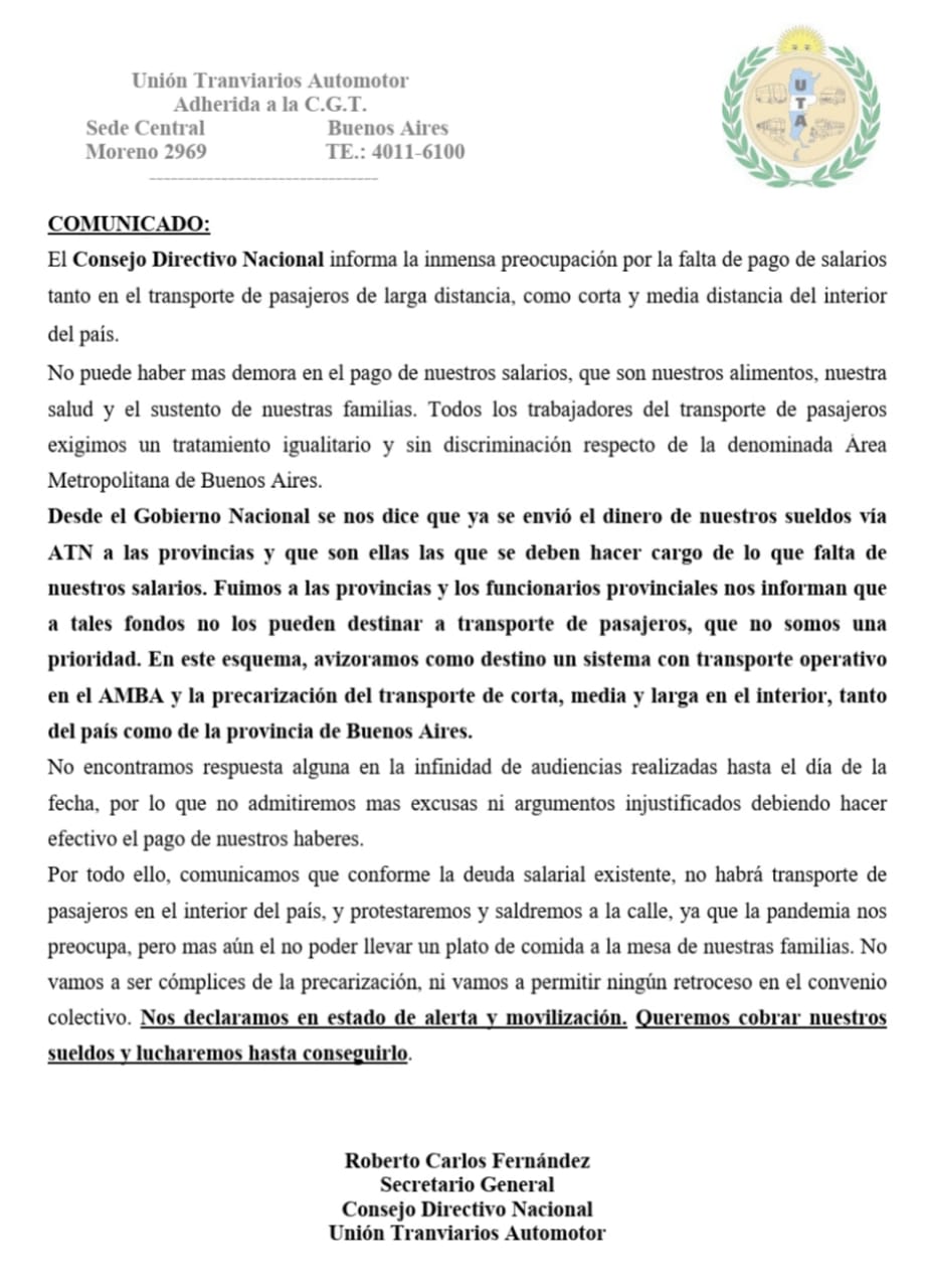 COMUNICADO: UTA Unión Tranviarios Automotor Nos declaramos en estado de alerta y movilización. Queremos cobrar nuestros sueldos y lucharemos hasta conseguirlo.