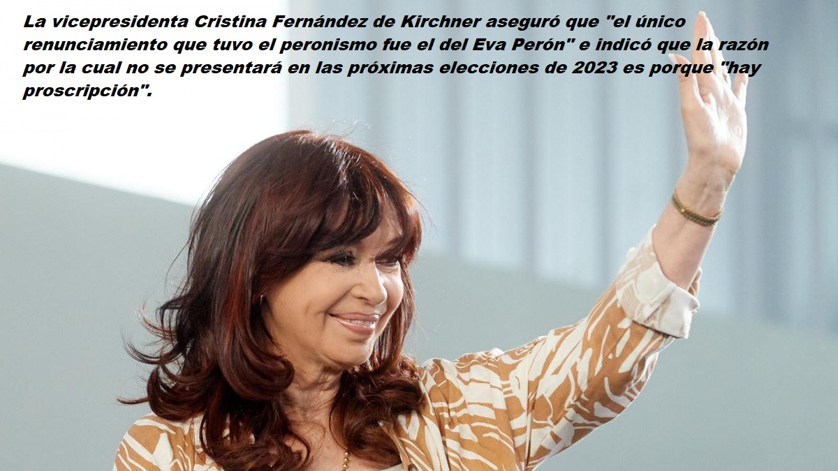 La vicepresidenta Cristina Fernández de Kirchner aseguró que «el único renunciamiento que tuvo el peronismo fue el del Eva Perón» e indicó que la razón por la cual no se presentará en las próximas elecciones de 2023 es porque «hay proscripción».