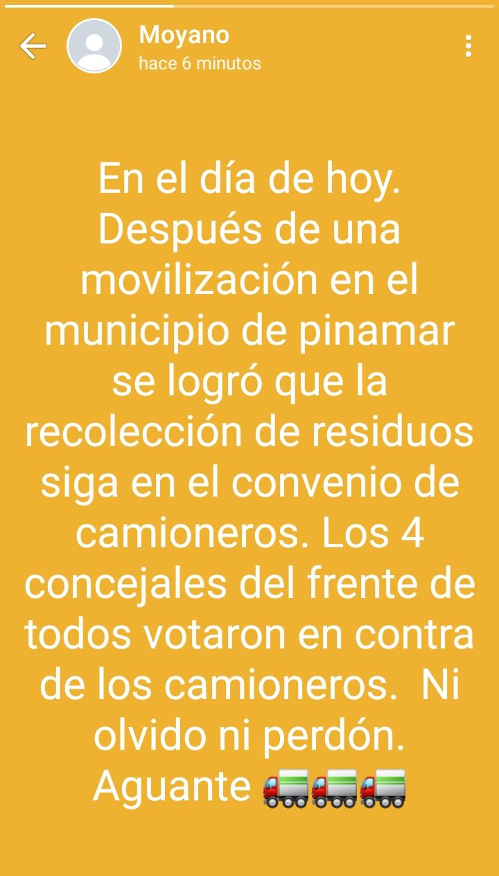 El resultado final de la votación fue de 8 positivos y 4 abstenciones, «ya que lamentablemente los 4 Concejales (Gregorio Estanga, Pablo Perrone, Ana Laura Alvarez Pinela y Violeta Saquilan del Frente de Todos) que no estaban de acuerdo con el proyecto enviado al Ejecutivo, de manera irresponsable e irrespetuosa, se fueron de la sesión.«, afirmaron desde el sindicato de Camioneros encabezado por Hugo y Pablo Moyano.