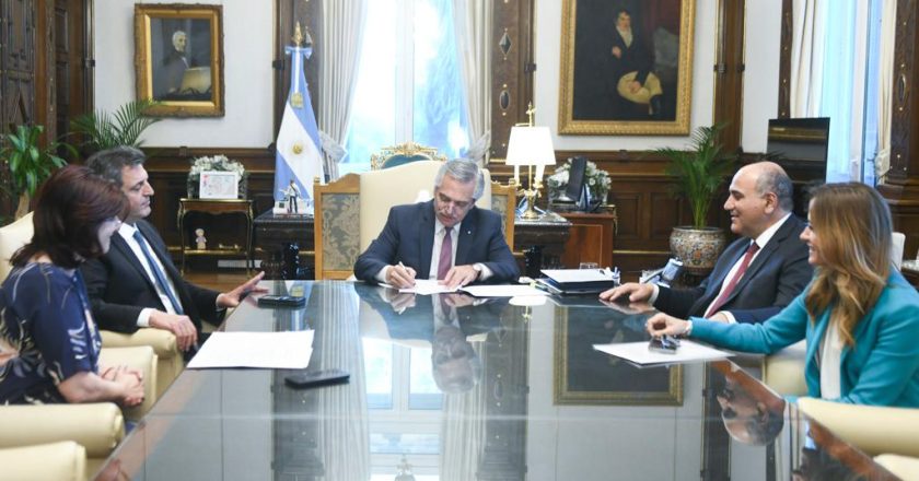 Por ese tema, el presidente Alberto Fernández recibió en su despacho de la Casa Rosada al jefe de Gabinete, Juan Manzur; al ministro de Economía, Sergio Massa, y a las ministras de Trabajo, Raquel «Kelly» Olmos, y de Desarrollo Social, Victoria Tolosa Paz, y firmó el decreto.