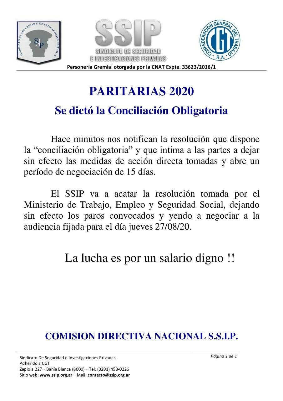 El SSIP informó este lunes el dictado de la conciliación obligatoria dispuesta por el Ministerio de Trabajo “que intima a las partes a dejar sin efecto las medidas de acción directa tomadas” y que “abre un periodo de negociación de 15 días”.