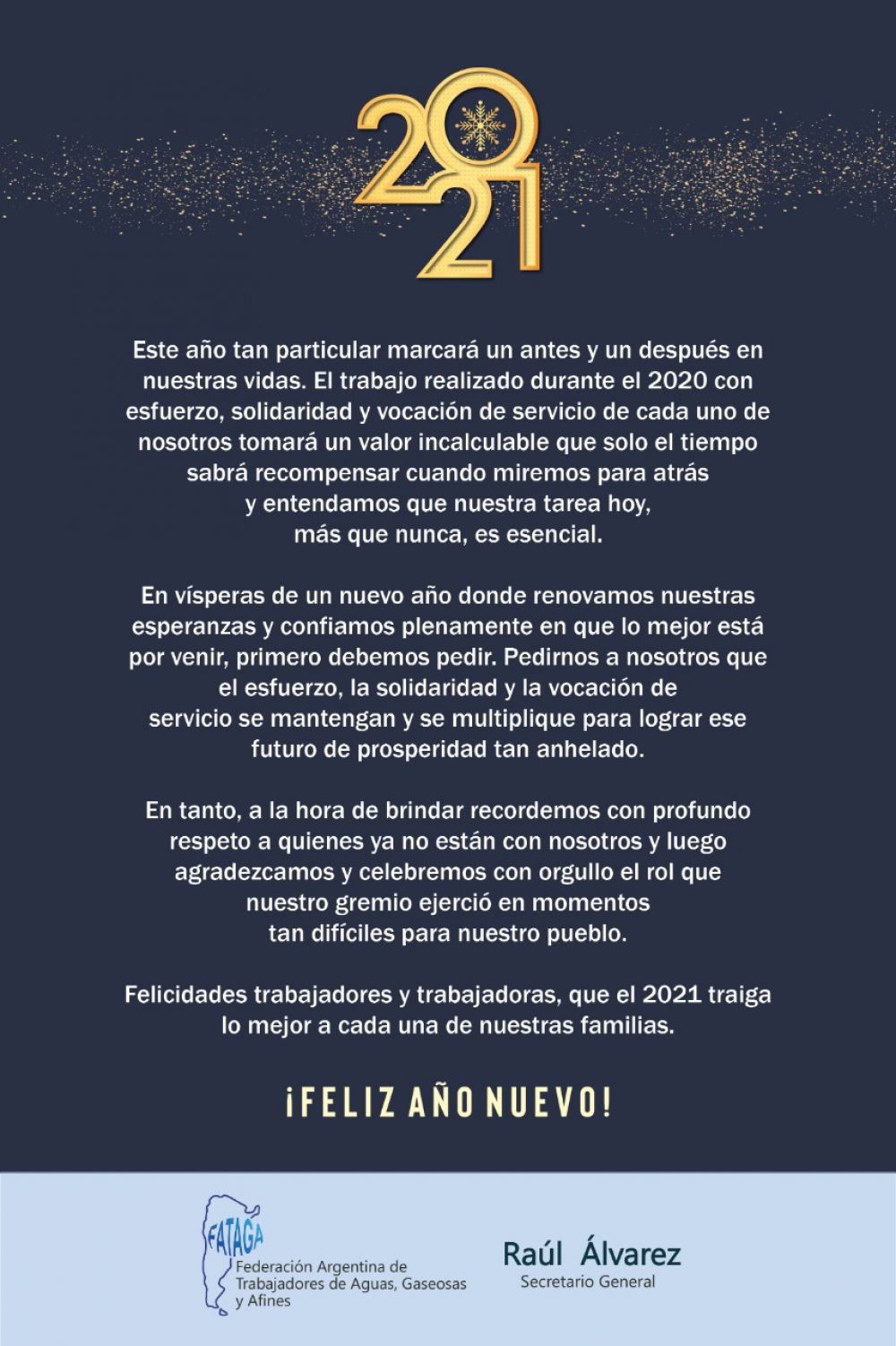 Desde la Federación Argentina de Trabajadores de Aguas, Gaseosas y Afines, su secretario general Raúl Álvarez envió un saludo en vísperas del año nuevo con agradecimientos por el trabajo en un año “que marcará nuestras vidas”.