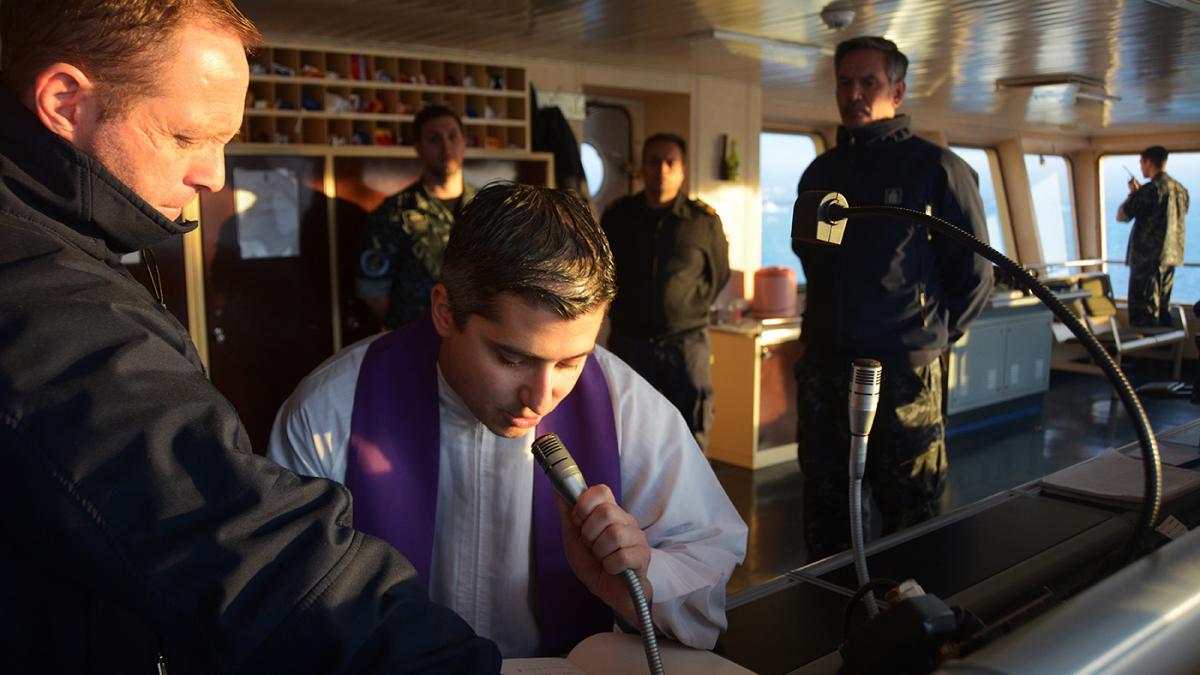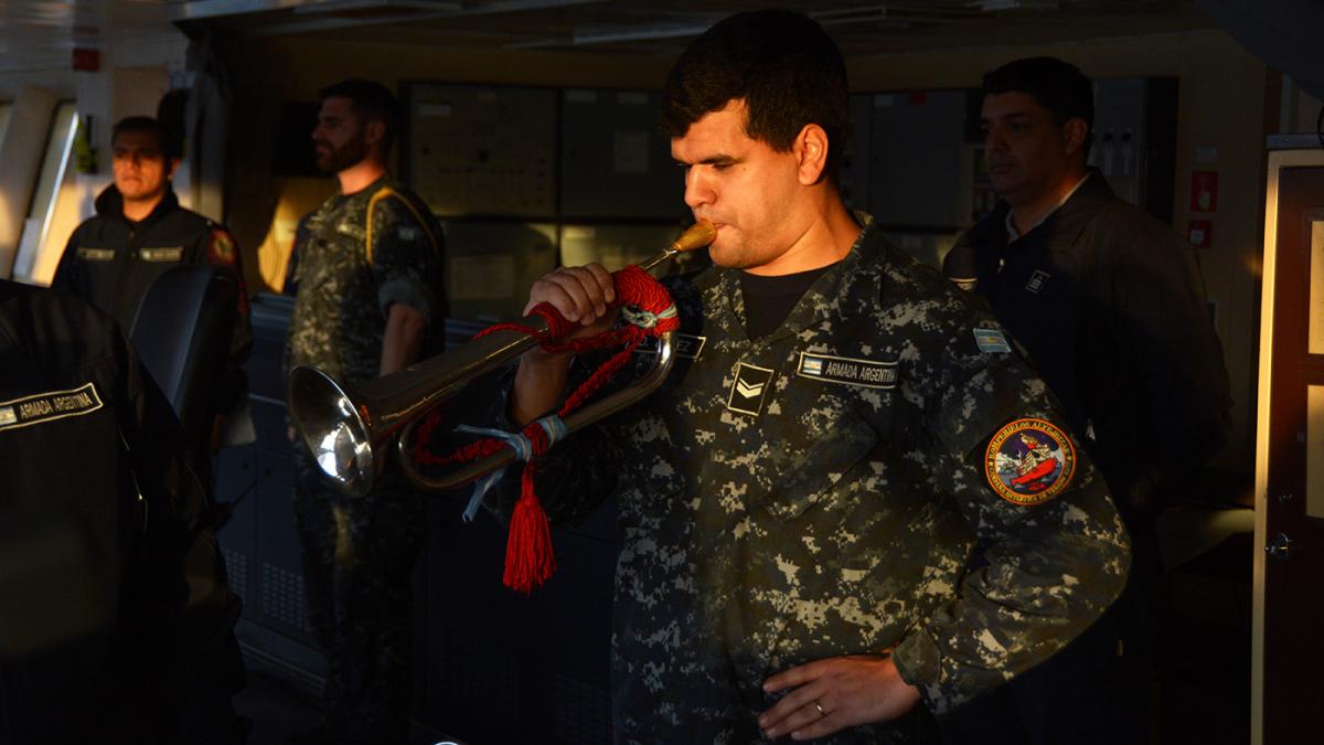 Al caer el sol, y mientras las lanchas de rompehielos todavía cruzaban materiales e insumos hacia la base Petrel, en todo el Irízar se escuchó la trompeta que efectuó el toque de silencio desde el puente de mando. –