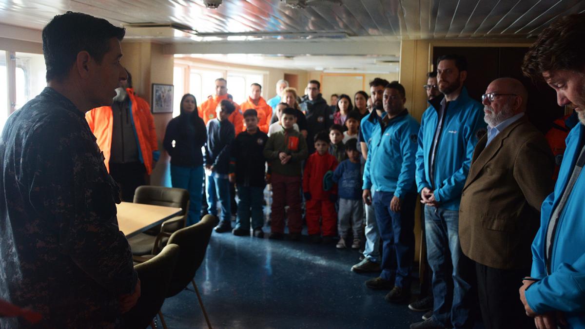 La jornada había comenzado muy temprano para la tripulación del rompehielos fondeado frente a la base Petrel, la cual decidió aprovechar los primeros rayos de sol para comenzar la descarga se suministros en ese emplazamiento antártico, mientras que las familias que no pudieron desembarcar aún en base Esperanza aprovechaban para conocer distintos espacios del buque.