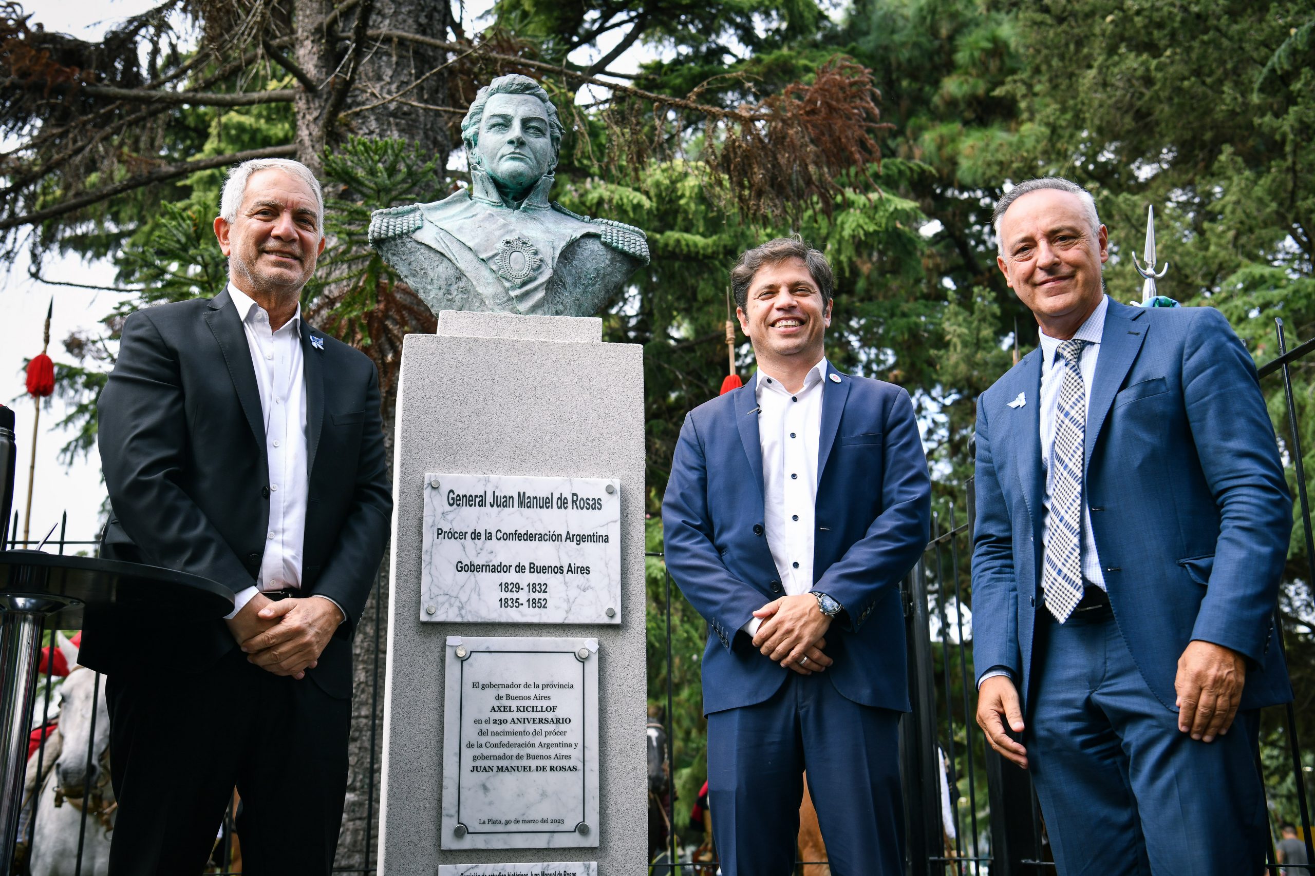 Axel Kicillof, encabezó esta tarde en La Plata un acto en homenaje a Juan Manuel de Rosas en el marco del 230° aniversario de su nacimiento. Fue frente al busto que se colocó en la plaza ubicada en la intersección de las calles 13 y 60, donde descubrió una placa conmemorativa junto al ministro de Justicia y Derechos Humanos, Julio Alak.