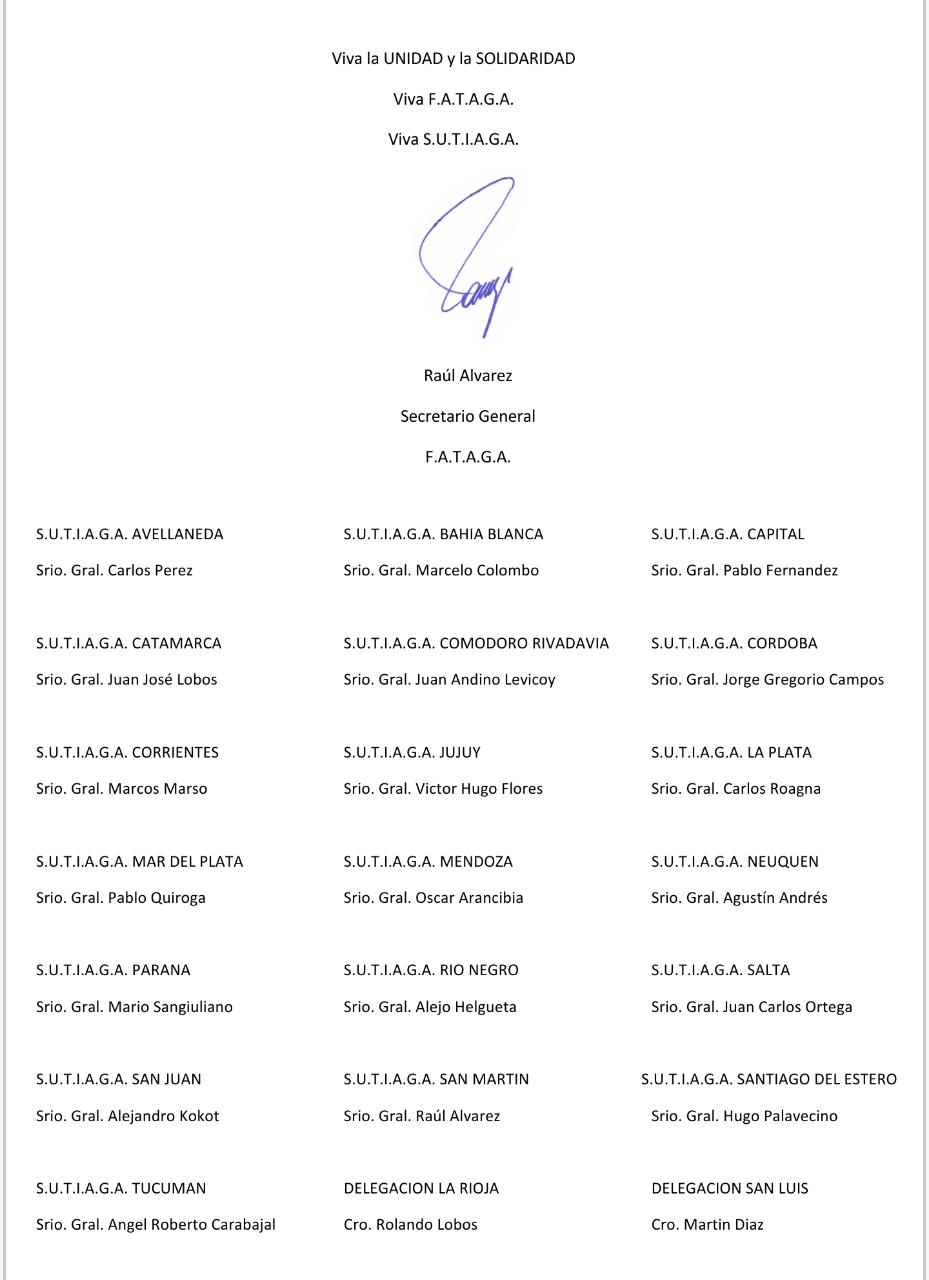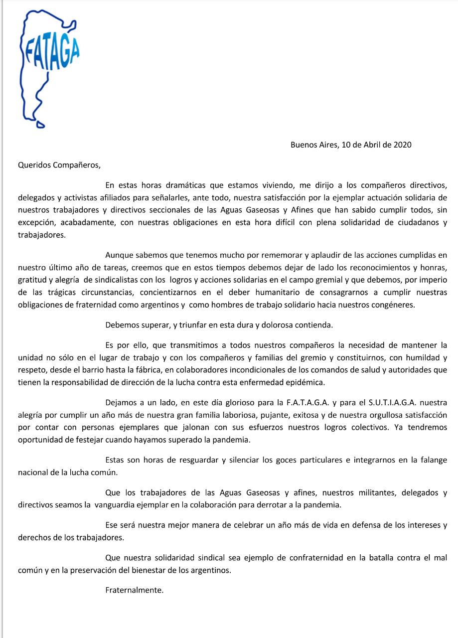 Con motivo de conmemorarse el del Día del Trabajador Aguas Gaseosas, la Federación Argentina de Trabajadores Y Afines F.A.T.A.G.A, que es representada por el Compañero Secretario General Raúl Álvarez, hiso extensivo un comunicado saludando a todos los Sutiagas que integran todo el País.