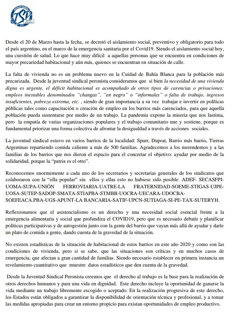 LocalSindicalesLa juventud sindical peronista Bahía Blanca reflexiona sobre la situación socio económica de nuestra cuidad en el contexto de pandemia Radio Gremial6 años atrás6 años atrás01 minutos FacebookXWhatsAppLOCALES//SINDICALES// Fuente: Juventud Sindical Peronista Comparte esto: Haz clic para compartir en Facebook (Se abre en una ventana nueva) Facebook Haz clic para compartir en X (Se abre en una ventana nueva) X Haz clic para compartir en instagram (Se abre en una ventana nueva) instagram Me gusta esto:Me gusta Cargando... Navegación de entradas Anterior: BAHÍA BLANCA «STIGAS» EL SINDICATO DEL GAS ANUNCIÓ UN PARO DE ACTIVIDADES EN MEGA Y TGSSiguiente: Ante la mención de la flexibilización laboral en la CGT reclama desactivar Gananacias