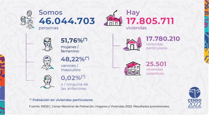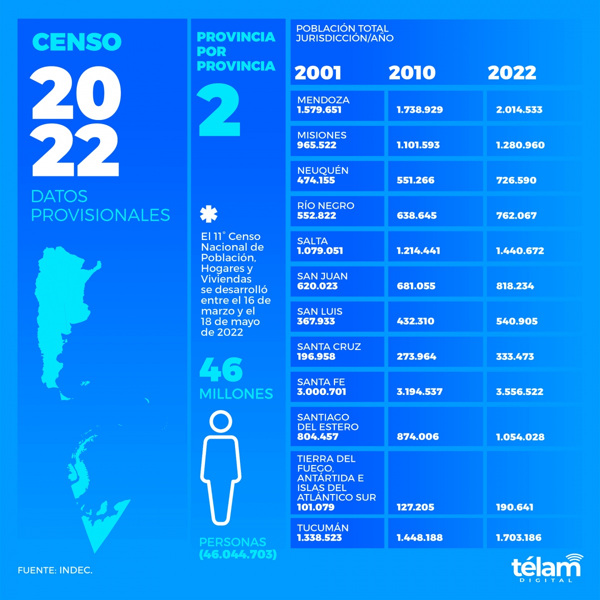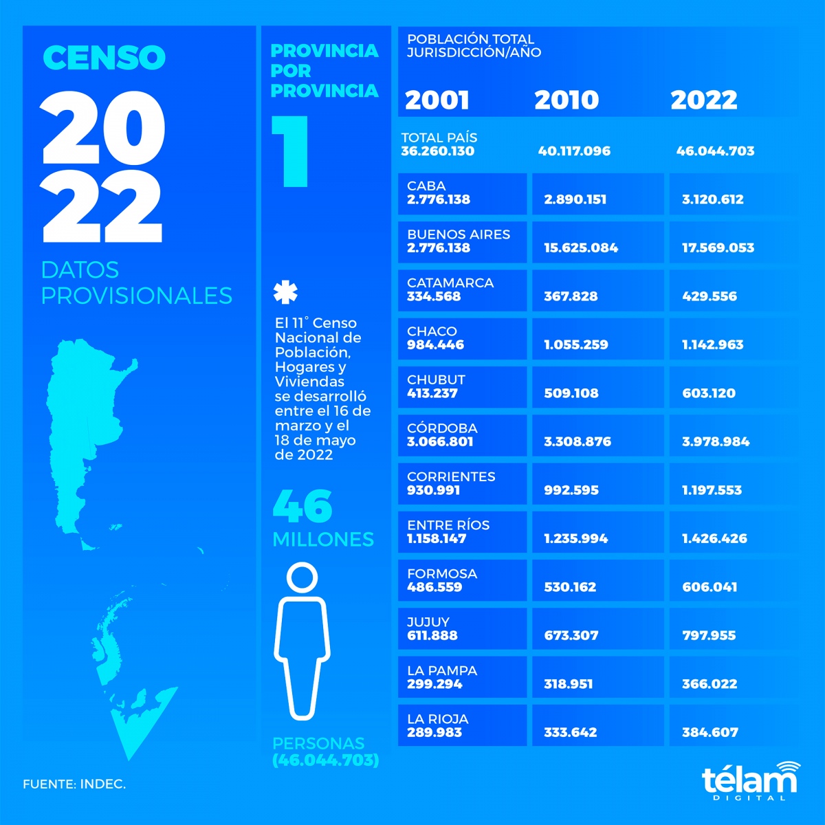 La población de Argentina es de 46.044.703 personas, lo que representa un crecimiento del 14,77% en relación con 2010, cuando se habían reportado un total de 40.117.096 habitantes, de acuerdo con los resultados provisorios del Censo 2022 difundidos este martes por la tarde por el Instituto Nacional de Estadística y Censos (Indec).