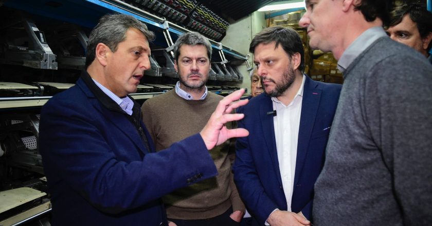 El ministro de Economía, Sergio Massa, visitó este viernes junto al precandidato de UxP a Jefe de Gobierno de la ciudad de Buenos Aires, Leandro Santoro, y al ministro de Turismo y Deportes, Matías Lammens, las instalaciones de la fábrica textil Galfione y CÍA S.R.L, ubicada en el barrio porteño de Villa Soldati.