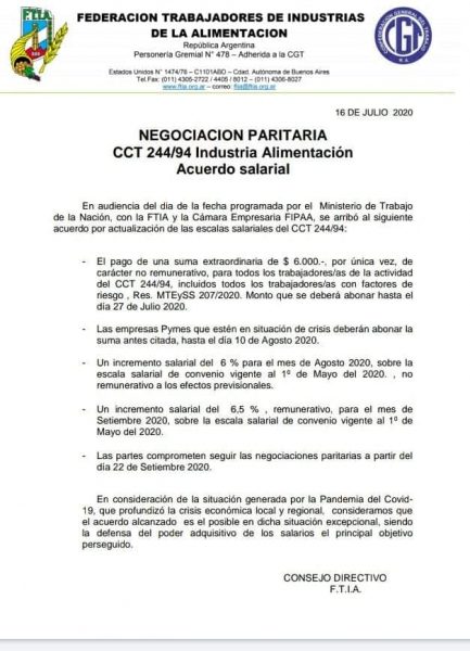 El  aumento salarial alcanzado por la FTIA beneficiará a los trabajadores alimenticios con un bono no remunerativo de $ 6.000  a cobrar por única vez en el mes de julio.