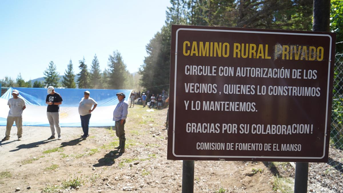 Para terminar la escena, detrás del grueso portón metálico un pórtico azul advierte: «Camino rural privado. Circule con la autorización de los vecinos, quienes lo construimos y lo mantenemos. Gracias por su colaboración. Comisión de Fomento El Manso».