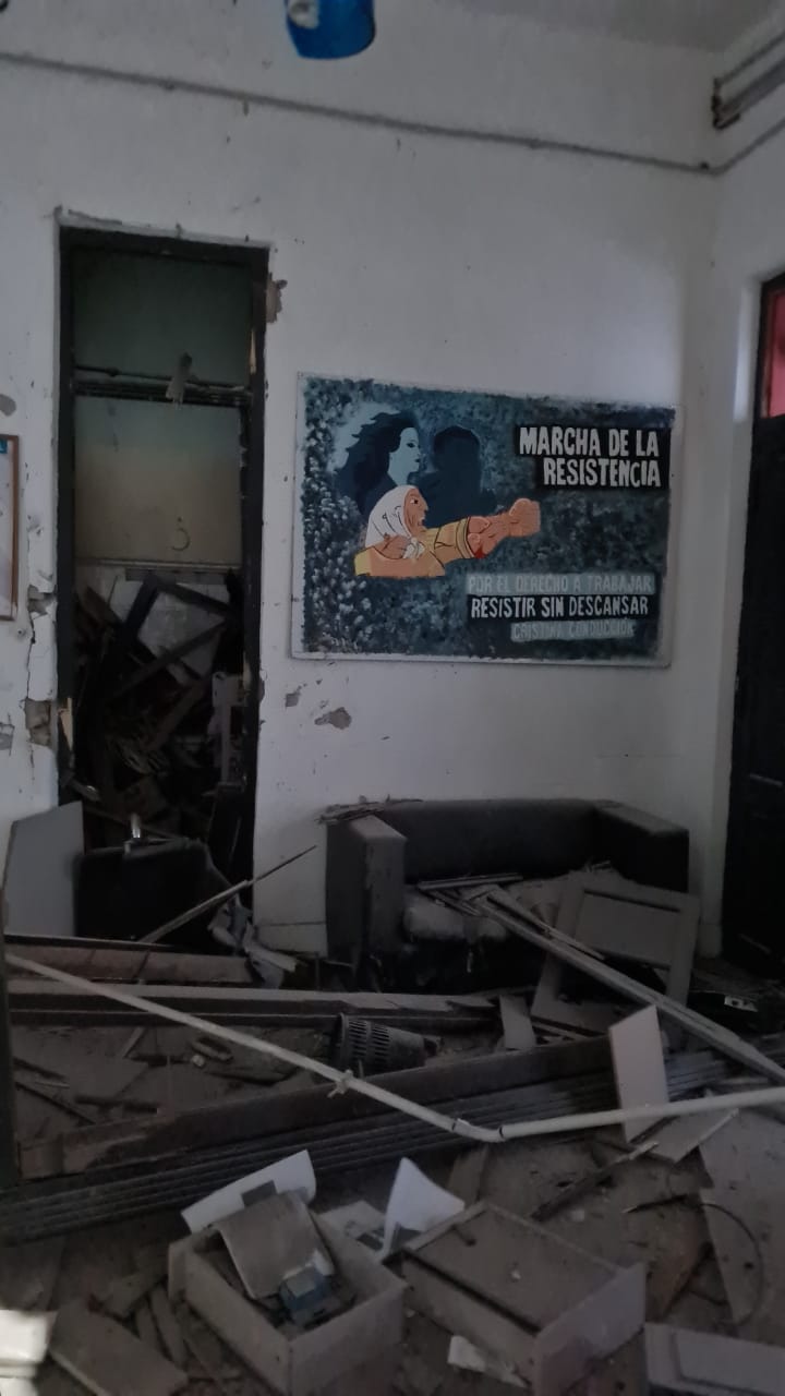 Entre los escombros, los vecinos hallaron esparcidos panfletos con amenazas a militantes de la agrupación política, periodistas, sindicalistas y jueces. Los mismos son a la vez una queja contra la situación económica que atraviesa el país y el aumento de la pobreza. En otro punto se menciona: “hipersuaxialización, pornografía, y subversión de los valores naturales”, tras lo cual agregan: “Y cuántas razones más para empezar la purga”.