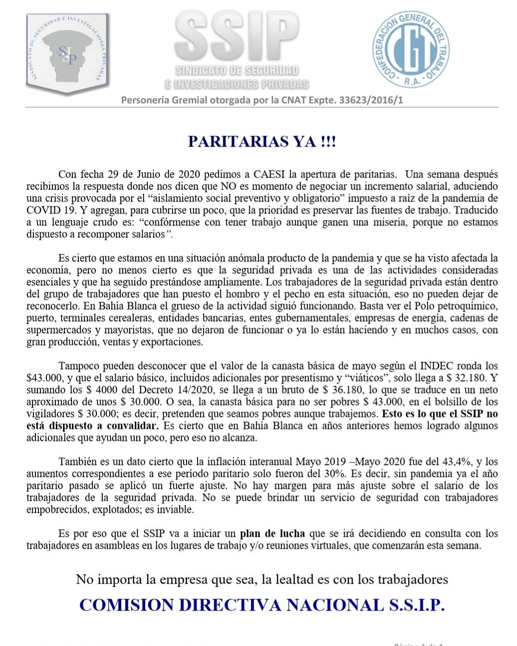 El S.S.I.P. Sindicato de Seguridad e Investigaciones Privadas, saco un comunicado pidiendo aperturas de Paritarias, por tal motivo inicia un plan de lucha que se ira decidiendo con los trabajadores en asambleas en lugares de trabajo y/o reuniones virtuales, comenzando esta semana…
