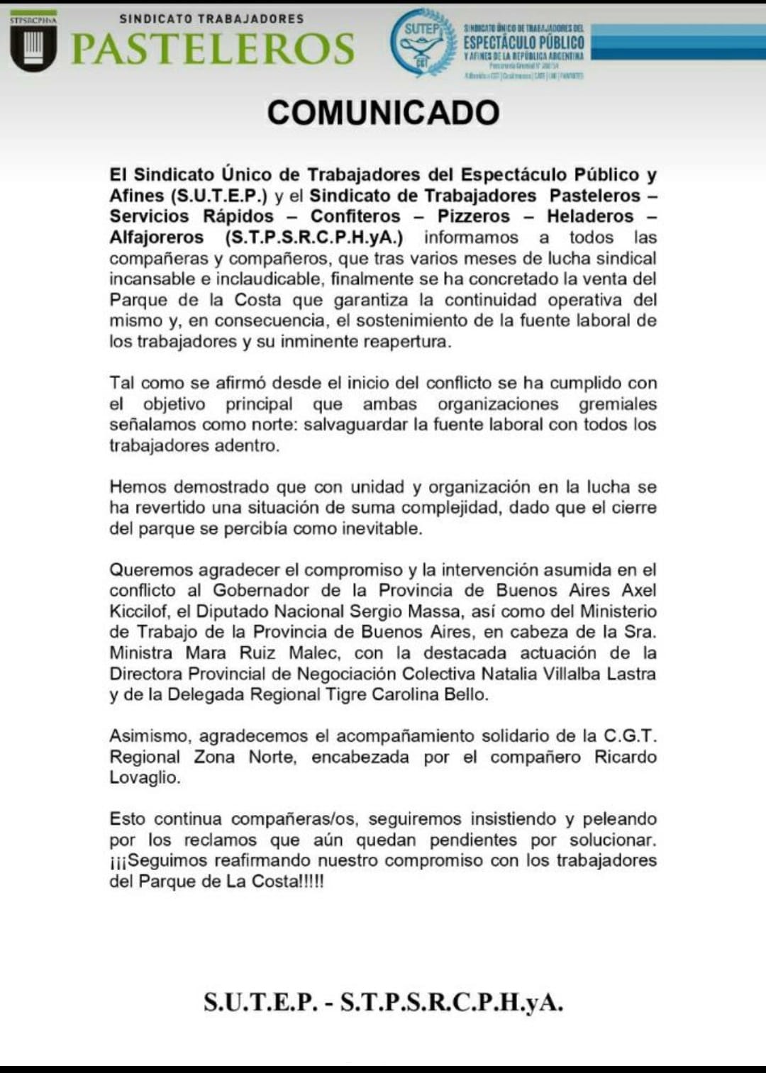 COMUNICADO EN CONJUNTO DE LOS SINDICATOS S.U.T.E.P. (Sindicato Único de Trabajadores Espectáculos Públicos y Afines y el Sindicato S.T.P.S.R.C.P.H. y A. Sindicato de Trabajadores Pasteleros , Servicios rápidos, Confiteros, Pizzeros,, Heladeros y  Alfajoreros.