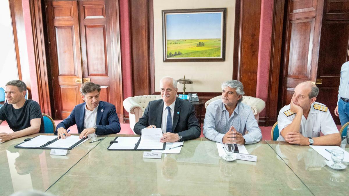 El ministro de Defensa, Jorge Taiana, y el gobernador de la provincia de Buenos Aires, Axel Kicillof, firmaron esta tarde un acuerdo para avanzar en la construcción de diversos medios navales requeridos por la Armada en los astilleros públicos de la Argentina, informaron desde la cartera castrense.