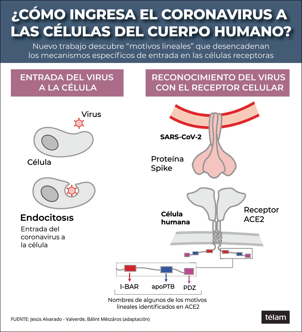 Lo que descubrimos en el trabajo fueron algunos elementos presentes en el receptor celular (ACE2), y en otras moléculas que postulamos que podían ser co-receptores, que nos dan indicios de cómo puede ser el proceso de señalización de entrada del virus. Esos elementos señalizadores se llaman técnicamente «motivos lineales».